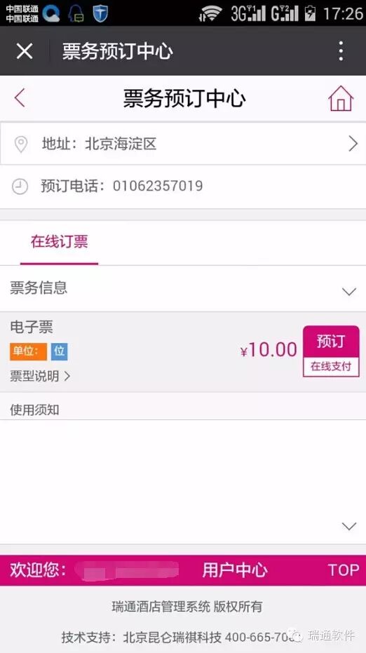 打开微信->选择电子票->在线支付->出示二维码使用->在线核销!简单完美的云票务系统应该是这样的;如果跟你想的一样,那么恭喜你,你关注的瑞通云票务就是这样的;