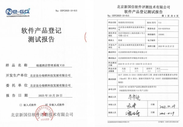 �� 重磅捷报传来!北京昆仑瑞祺科技发展有限公司自主研发的 瑞通酒店管理系统 ,历经严格审核与专业测试,成功通过北京新国信软件评测技术有限公司的国产化软件产品登记测试,以卓越性能斩获权威认证!这不仅是对产品品质的高度认可,更是公司深耕国产化软件领域的重要里程碑!