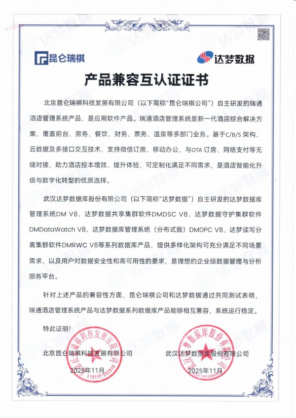 喜报传来!北京昆仑瑞祺科技发展有限公司自主研发的瑞通酒店管理系统,成功通过武汉达梦数据库系列产品兼容互认证,双方产品适配流畅、运行稳定,为酒店行业数字化转型注入双重硬核力量!